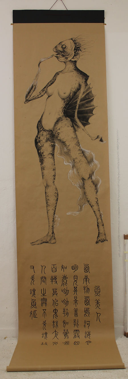 Die Zeichnungen sind weiterhin Werke der Serie vom „Bekleideten Biest“. Shan Hai Jing als meine Quelle von Inspirationen, die mir tiefere Sprache der Kunst geben können.